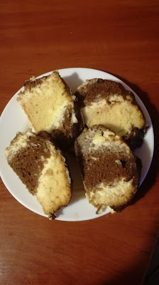 Jajka utrzeć z cukrem do białości, cały czas miksując dodać olej i wodę. Następnie dodać mąkę wymieszaną z proszkiem do pieczenia ( tu już mieszamy szpatułką). Ciasto podzielić na dwie równe części. Do jednej części ciasta dodać kakao, a do drugiej dodać 2 łyżeczki mąki. Dwie jednakowe długie blaszki (keksówki) natłuścić i wysypać bułką tartą. Do jednej blaszki wylać jasne ciasto a do drugiej ciemne. Ciasta piec jednocześnie w temp 180 ok. 45 minut. Budyń ugotować zgodnie z instrukcją na opakowaniu używając podanej ilości mleka tj 0,75l. Wystudzić. Miękkie masło utrzeć na puch i dodawać po łyżce budyniu i miksować do konsystencji gładkiego kremu.