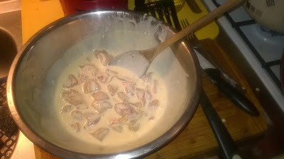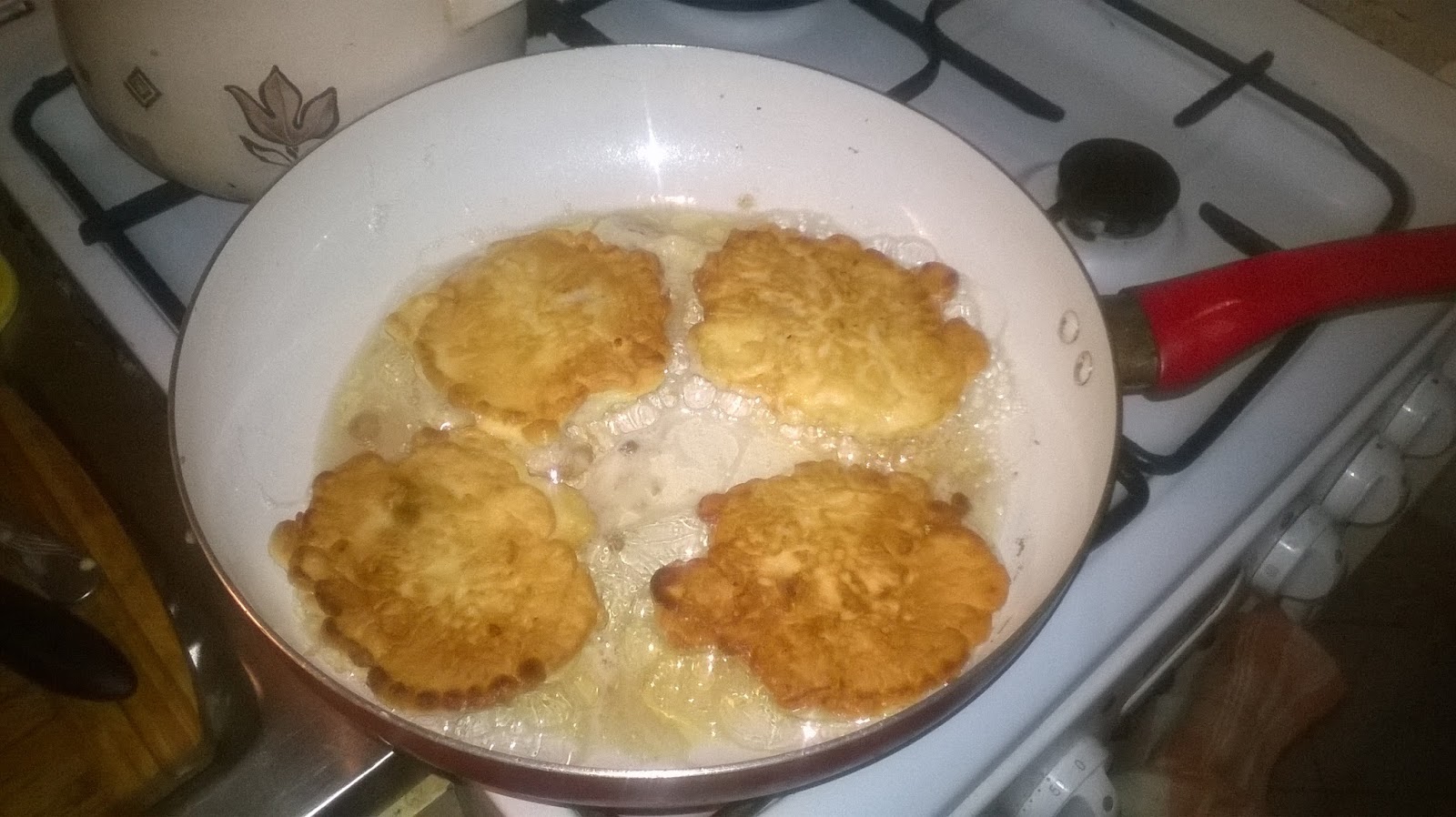 Piersi z kurczaka pokroić w kostkę oprószyć do smaku wegetą i odstawić na ok 30 minut do lodówki. W tym czasie zblendować jajka, mąkę i majonez na gładką masę. Zalać kurczaka i smażyć na oleju nakładając łyżką jak placki ziemniaczane.